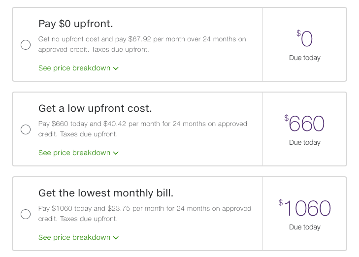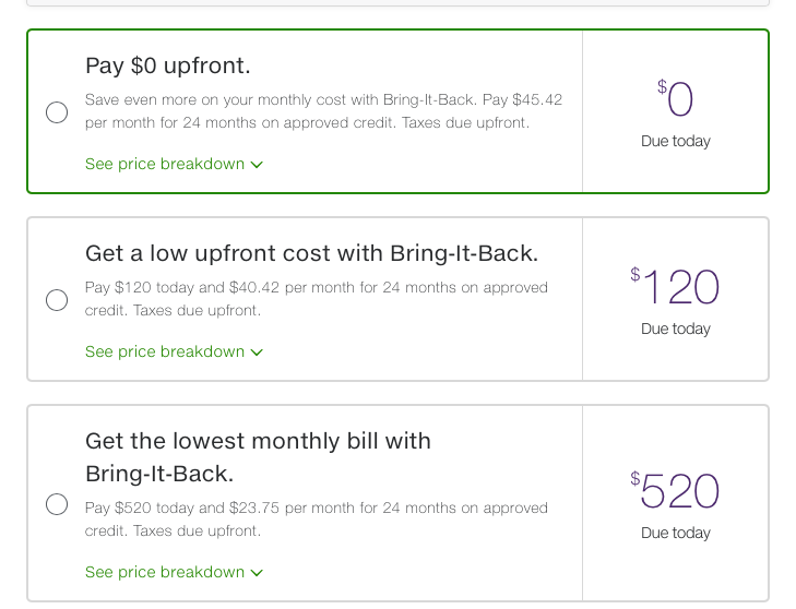 • Look up the Easy Payment and Bring-it-Back programs. Either give you options to pay varying amounts up front, and a monthly rate. I screenshot options for you below showing what it would look like for an iPhone 11 Pro with 256 GB of storage. The amounts will change based on the phone you're buying. The difference in cost is because with Bring-it-Back, after 24 months you either have to trade your phone in or pay the difference.