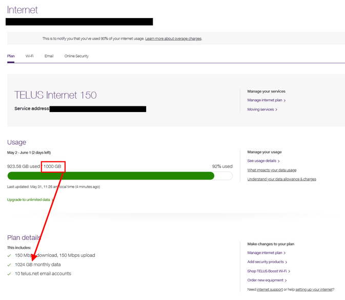 When I log into my Internet plan info, it shows my plan as Internet 150, which includes 1024GB of data as seen in the screenshot and on the Telus Support page
