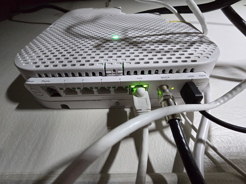 the router with the thingy mounted on the wall with two wifi things branching out of the Fiber thingy mounted on the wall.