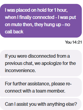 After two hours on hold, was told that I would be connected back to Loyalty withing a few minutes - reached the prompt: "let us find a team member that can help you"