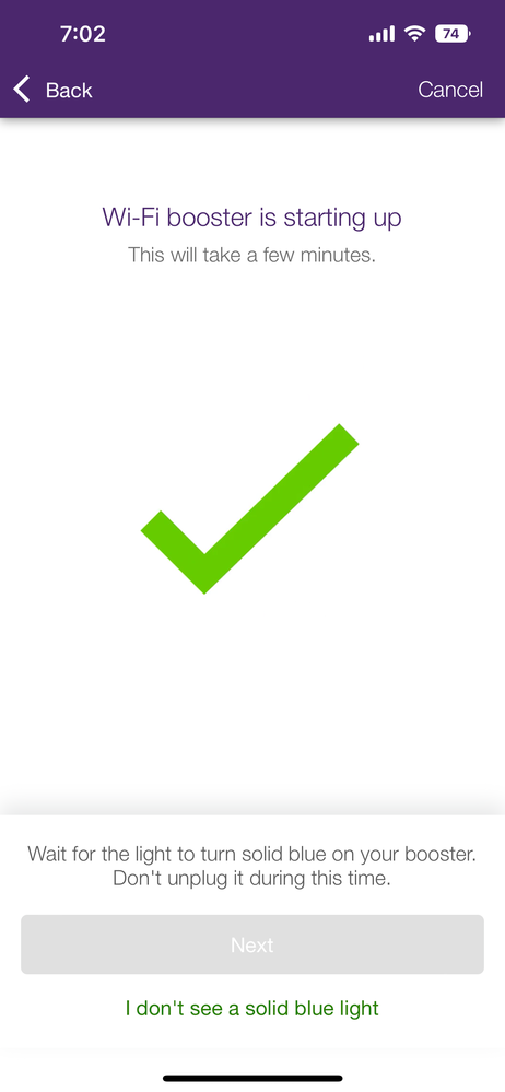 the tech said that the technology is backwards compatible so it should be fine. but the app is stuck. it gives me the green check mark, the light is solid blue but i cannot move forward with the app as the next button is greyed out, as you can see its just nothing, i don't know whats going on. i tried both of them same thing. i get a notification saying a booster has connected to my home network and then i look at that notification and it says this