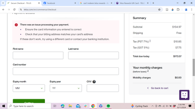 I have $175 worth of Telus prepaid visa. I am trying to order some accessories online but I keep getting an error