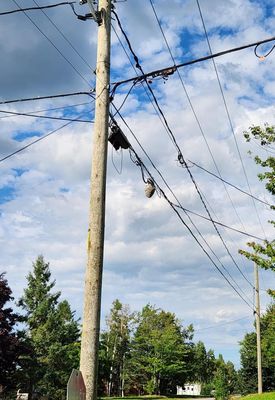 Bonjour, J'ai appelé a la ville (Rimouski) concernant un nid de guepe dans les fils devant chez moi et ils m'ont répondu que ce n'est pas a eux de gerer sa et de m'essayer avec Hydro ou bien telus. Car le nid semble être sur un module de telecom? J'aimerais le détruire moi meme mais c'est trop haut je n'ose pas aussi a cause des fils électrique. Selon les photos jointe est-ce vraiment a telus le genre de module ? merci de m'aider