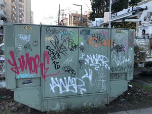 Hello. I am reporting a graffiti covered green TELUS box which is located on the property line at the address 1460 Barclay Street. The green box is physically located on Nicola Street near Ted Nort...