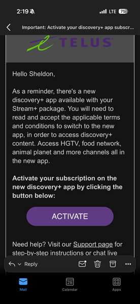 I posted about this a couple months ago as TELUS started sending me emails at the beginning of the year to activate the new Discovery+ app. The link they’d email me never did work and eventually they told me it never would.
