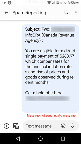 Lately I have been unable to report text spam to 7726, as per Telus page Report a spam message. When I try to send it, I get a response in red, "Message not sent: invalid message". Why is this happ...