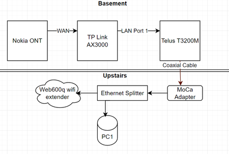 For anyone else who comes across the same problem -- I ended up going with the configuration in the above image except I took out the T3200M. Bridging mode would be necessary for me if I didn't have an ONT that supplied me ethernet but since it does -- I can just connect that to the WAN port of my new router. Unfortunately, this meant that I ended up having to buy another MoCA adapter ($50 secondhand, not that bad) and now it's just a simple router & MoCA adapter configuration which wasn't too hard to setup.