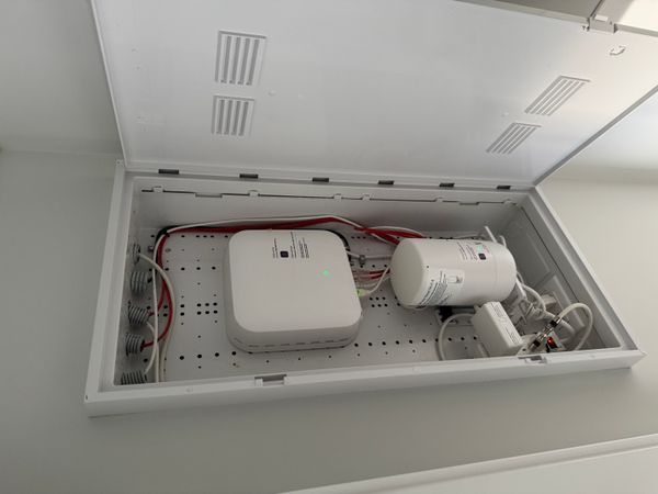 You need to return the NAH (square box) and cat cable plugged into 10G port, Booster (cylinder), power supply, cat cable from NAH to Booster. House wiring coming in from the top and bottom left corner can stay.