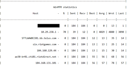 |------------------------------------------------------------------------------------------| | WinMTR statistics | | Host - % | Sent | Recv | Best | Avrg | Wrst | Last | |------------------------------------------------|------|------|------|------|------|------| | 192.168.1.254 - 0 | 40 | 40 | 0 | 0 | 1 | 0 | | 10.145.148.1 - 0 | 40 | 40 | 4 | 4 | 5 | 4 | | sttlwawbci01.bb.telus.com - 0 | 40 | 40 | 28 | 28 | 30 | 29 | | six.riotgames.com - 0 | 40 | 40 | 25 | 25 | 35 | 26 | | 104.160.129.35 - 0 | 40 | 40 | 28 | 28 | 29 | 28 | | 104.160.131.3 - 0 | 40 | 40 | 59 | 59 | 61 | 59 | |________________________________________________|______|______|______|______|______|______|