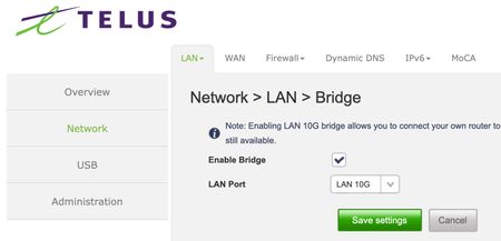 I want to use the Unify Cloud Gateway Fiber (UCG-Fiber) to service the internal LAN and the Unify Access Points. Telus Network Access Hub (NH20A) Bridge mode 10G port --> Unify Cloud Gateway 10G WAN...