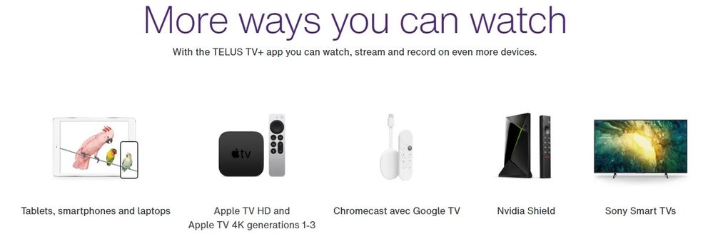 Supported devicesThe TELUS TV+ app for Android TV is currently supported on Nvidia Shield, Sony TVs running Android TV and Chromecast with Google TV.