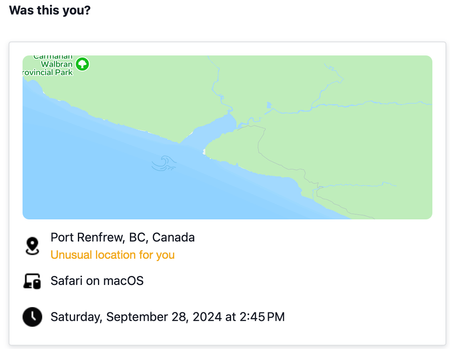 Just logged into FB on Safari, then get a notice from FB in my email wondering why I am logging in from Port Renfrew, when I am sitting in Chilliwack.