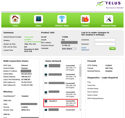 .1.254 is your NAH (the fibre router). Take the cover off it, and you will see the password for it. Once in it, you can find the boost listed as connected devices; it will also give you its IP. Click it, and this will give you the web interface for the Boost 7. Use the admin password that's located under the boost unit. Boost unit rest does not work for me, but you can reset it in the web interface.