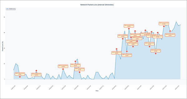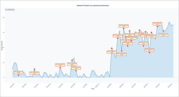 My network is completely idle, with only the computer used to test packet loss connected. I've been testing for about 12 hours and I've created a chart with the results. Packet loss has skyrocketed and is as high as 80% at the time of writing.