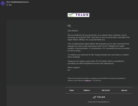 Hello Everyone, I got an phone call recently with an email regarding a "promotion/discount". Was wondering if anyone else had 587-812-8188 with an email from someone named max (Telus@saledepartmen...
