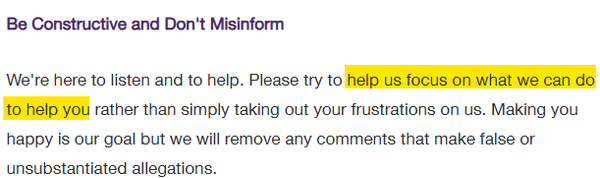 We're here to listen and to help. Please try to help us focus on what we can do to help you rather than simply taking out your frustrations on us. Making you happy is our goal but we will remove any comments that make false or unsubstantiated allegations.”