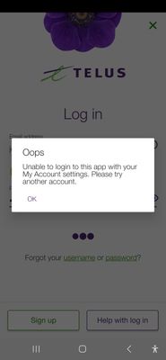 I have a My Telus account and am trying to log into Telus Connect to set up my wifi. Any time I try to log in I get the following message. "Unable to log into this app with you mytelus account settin...
