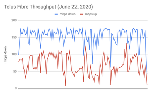 I keep having connectivity problems with my Fibre account. This is a graph of my up and down speeds measured every five minutes. Terrible reliability. I've installed wifi extenders to no avail. Very ...