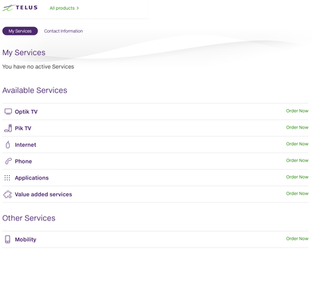 This is the webpage that loads when I select that I would like to "manage my Internet plan" in the Telus Account area. This has never worked correctly. Note that it says "You have no active services....