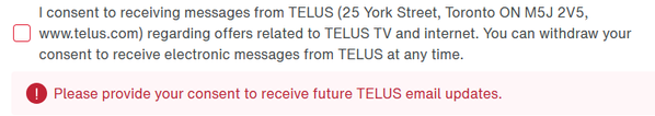 As part of the process to submit a request to move my services to a new address, I was presented with this check-box at the bottom of the form. This is not a box to indicate reading or agreeing to any terms or conditions, it is simply a box to say "Yes, I would like to receive more spam emails from you." In every case that there is a check-box like this on a form it is always optional. However, in this case it was NOT optional. It was required to click on it in order to submit the form. That's just wrong. Yes, it does say you can "withdraw your consent... at any time," but I shouldn't have to be forced to give "consent" in the first place to submit a required form.