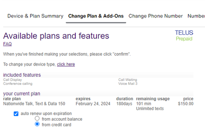 This option require you to choose from the $10, $25, $50, $100 pre-sets. The remaining balance not used to renew your $150 plan can be used to make long distance calls, use additional minutes, messaging, or data not included in your plan as pay-per-use. - Renew plan from credit card.