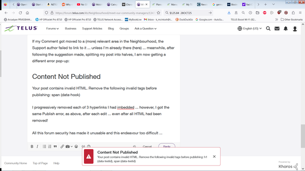 Hello TELUS Support Team ... I'm wasn't able to 'Publish' (two different types of errors, one pictured below) ... I wasn't even able to reach out to you folks via the Neighbourhood forum (until today) ... see screenshot of my attempt: