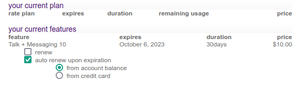 The account features, talk + messaging 10, showed as expiring on Oct 6.