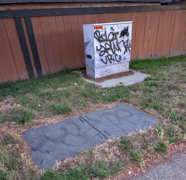 The box number is 1321 A, and it's located beside the residence on 2672 Scott Street (corner of Kings & Scott). Note that the graffiti extends beyond the box itself, to the metal plates.