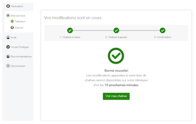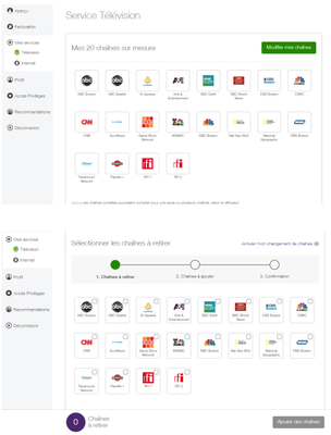 - Vous pouvez ensuite faire la sélection des chaînes que vous désirez modifier. Vous pouvez changer le forfait complet ou des chaînes individuelles. Une fois que votre sélection est complète, appuyez sur «valider ma sélection».