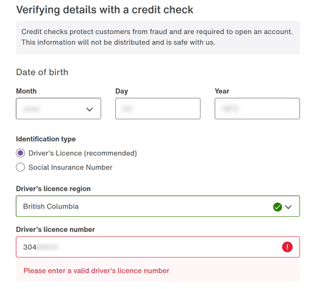Forgive me if this is the wrong place to post this, but I can't find support for Telus' website or app. I can't add a mobile service to my cart. During the "Verifying details with a credit check" step, I get an error saying my BC driver's license number is invalid. See screenshot. I tried different family members’ BC driver’s licence numbers and none pass validation. It appears to be a bug in the web form.90Views0likes1CommentPlease help with completing setting up my account with My Telus app.